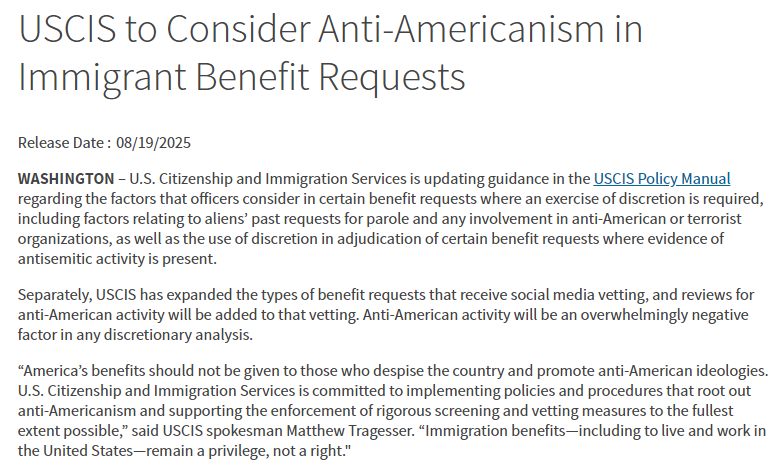 这些变化不仅涉及儿童身份保护法(CSPA)“表B锁龄”的取消、亲属移民政策的收紧,更首次明确将“反美主义”(Anti-Americanism)活动列为行使自由裁量权时的“重大负面因素”。