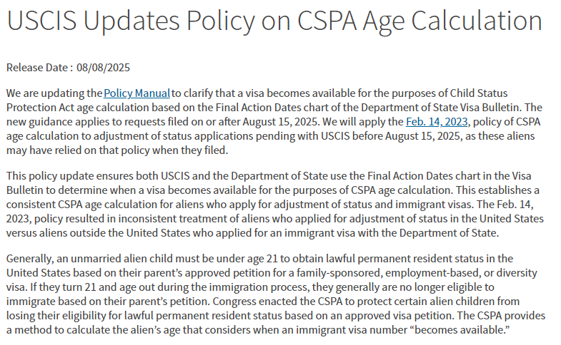 这项新指引将适用于2025年8月15日及之后提交的申请。而对于2025年8月15日之前提交、目前仍在美国移民局审理的身份调整申请,将会继续沿用2023年2月14日发布的CSPA年龄计算政策。