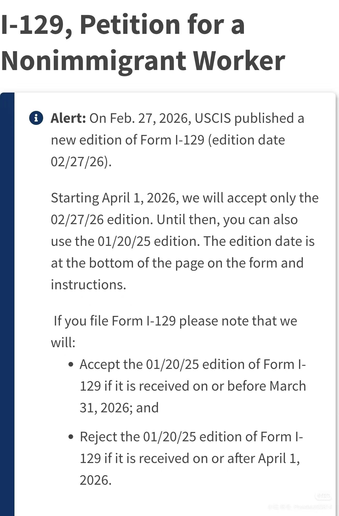 - 强制生效日:4月1日起,移民局仅接受新版I-129,旧版直接拒收驳回